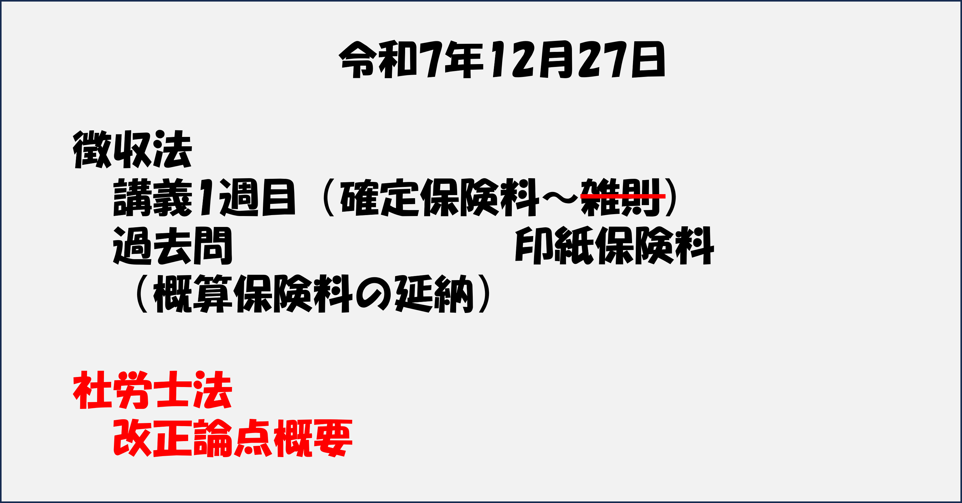 まとまった時間が取れなかったため、本編の講義を半分進めたところで、改正論点であり合格後の実務にも直結する社労士法の改正講義を受講しました。今回の改正で特に注目すべきは以下の2点です。