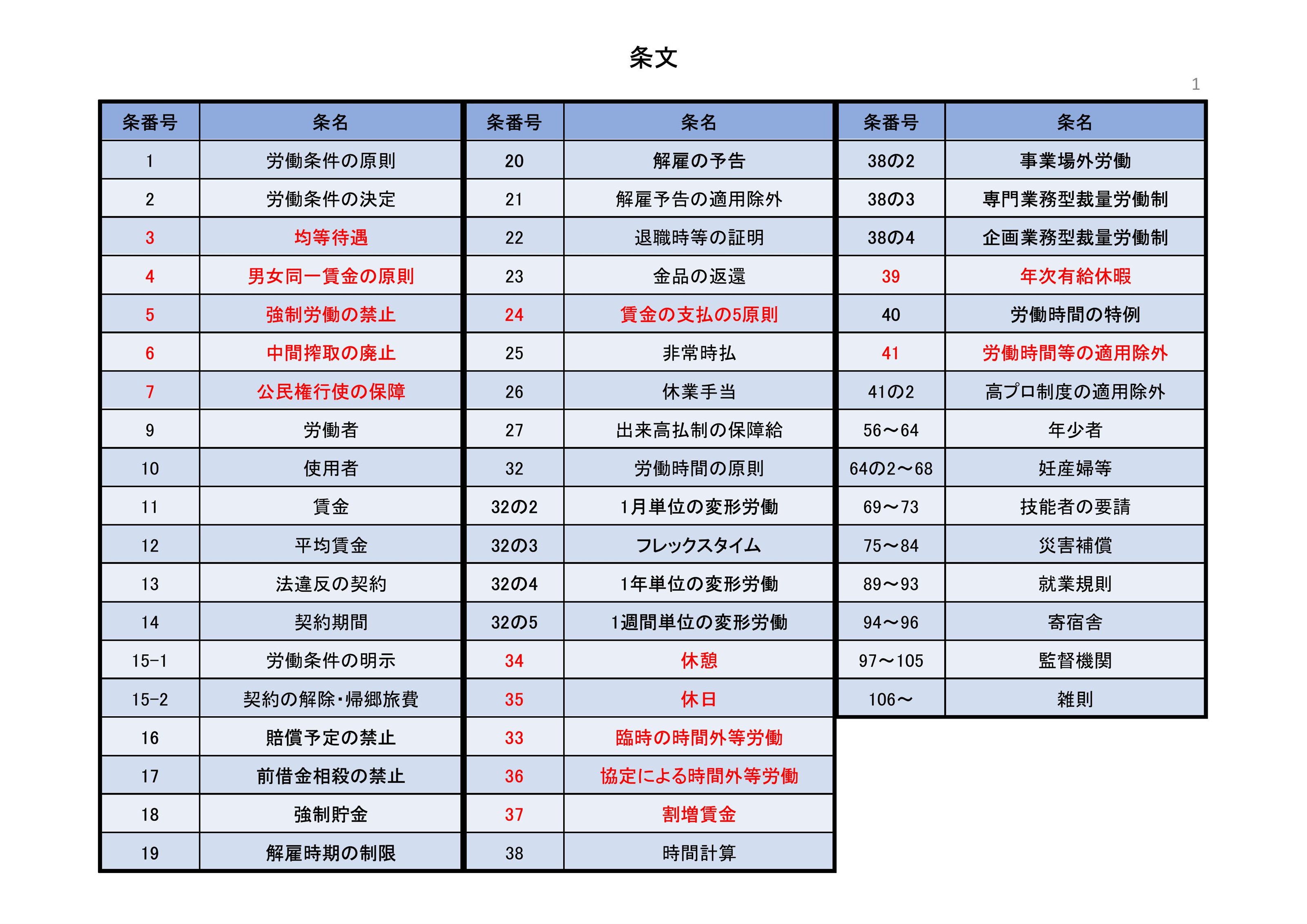 社労士試験では、問題文に条文番号しか示されないケースが稀にあります。主要なものだけでも番号と内容を一致させておくことは、得点源を守る上で欠かせません。また、労働時間の例外規定は似たような要件が多く混乱しやすいため、図解を交えて改めて頭の中を整理しました。